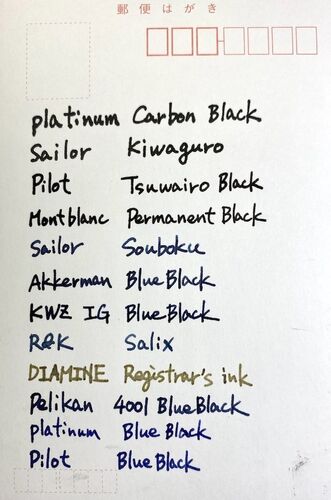 万年筆にはまり始めた頃に、年賀状の宛名を万年筆で手書きするため、万年筆インクの耐水性を試したことがありました。 その時比較したのは、プラチナ カーボンインク、プラチナ ピグメントブルー、セーラー 極黒、セーラー 青墨の顔料インク4種と染料のパイ…