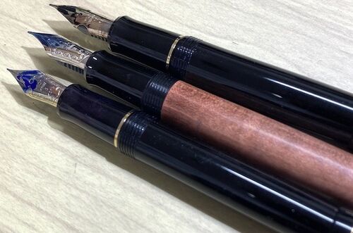 パイロットの顔料インク 強色を万年筆に入れました。742フォルカン、カスタムカエデ F、74 SF、ラーメンはカタやけど、万年筆はヤワ好きです。 最近パイロットのインキを使っていなかったのは、コクヨの野帳で微妙に裏抜けして両面使いづらかったからなので…