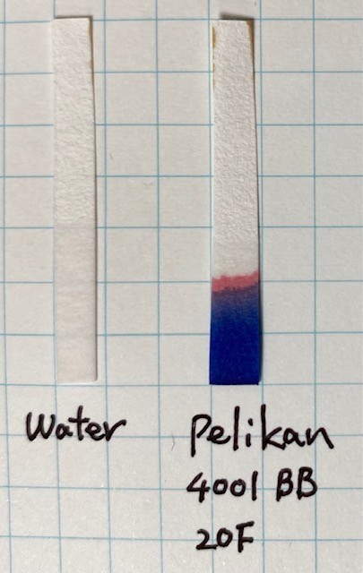 二価鉄試験紙の一端に、希釈したペリカン ブルーブラックを付け、ペーパークロマトグラフィーの要領で展開させて赤く変色すれば、二価鉄を含む古典ブルーブラックインク (没食子インク) だという証拠になります。