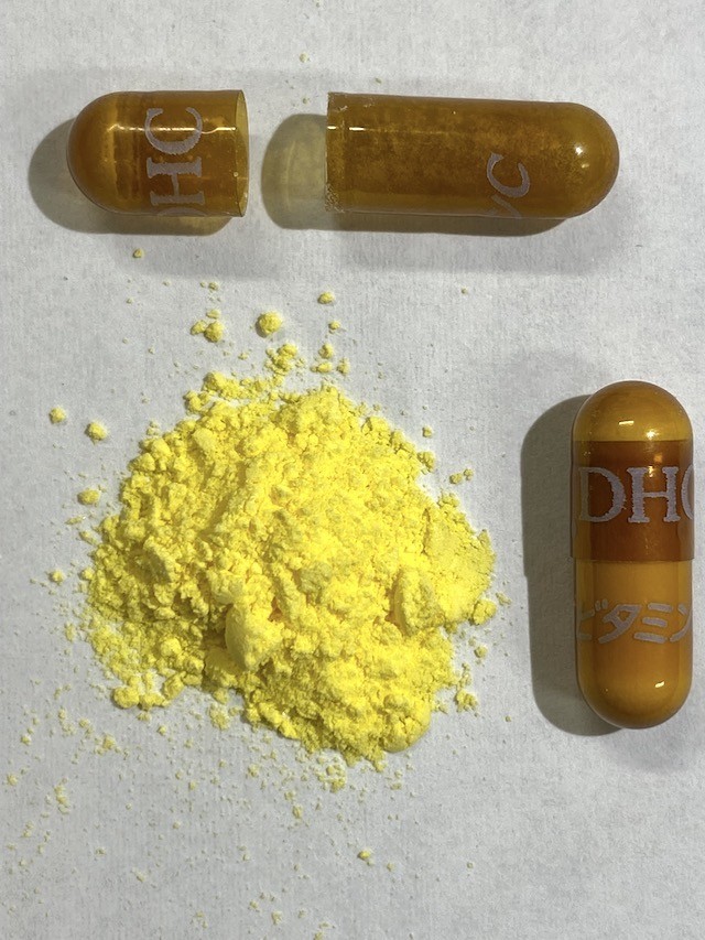 カプセルの材料がゼラチン、カプセルを茶色に着色しているのがカラメルで、カプセルのDHCの文字の印字が酸化チタンでされているので、カプセルを開けて中身だけ使えば、ちょっとだけVB2が混じったVCが手に入ります。
