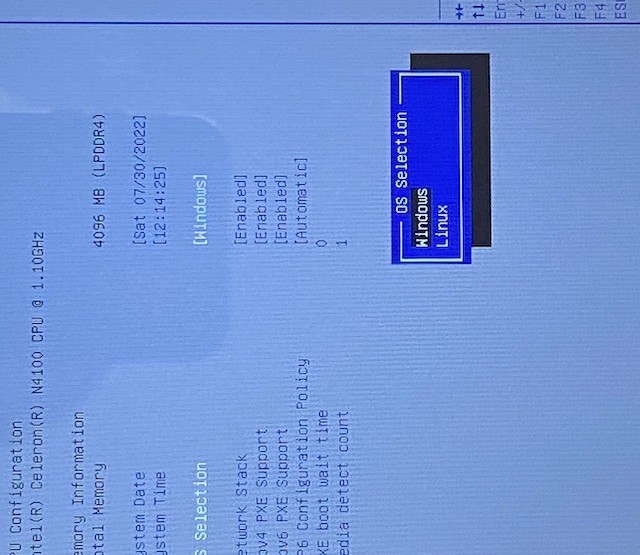 付属のキーボードを繋いで、Escキーを押しながら起動するとBIOS画面に入り、画面は縦長に表示されます。特に変更する項目はありませんが、OS SelectionというメニューでWindowsとLinuxを選択できるようになっています。