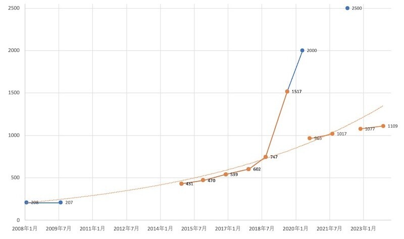 指数関数的に増えていっていたのが、少し落ち着いてきたように見えますが、実際には御当地インクなどインクカタログに掲載されていないインクが大量にありますので、ビックバン的に増えていると思われます。