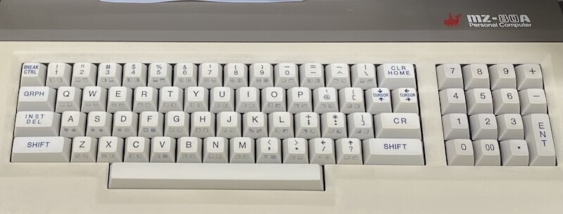 前回も話題にしたMZ-80K系列の初代です。セミキットで発売されキーボードは自分で組み立てる必要がありました。オーソリニア配列のキーボードです。