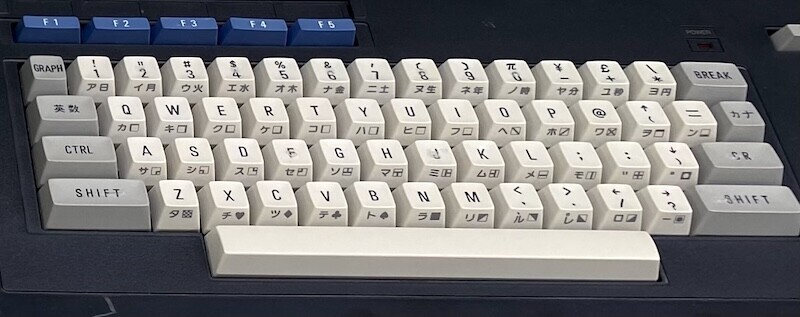 右側の記号入力部がカーソルキーになり、ゲームするとき便利と言えば便利なのですが、この当時はテンキーで操作するゲームも多くて、斜め移動は1379を使うプログラムもよくあったので、移植するとき、ここにテンキーみたいなキーボードが欲しいと思うこともありました。